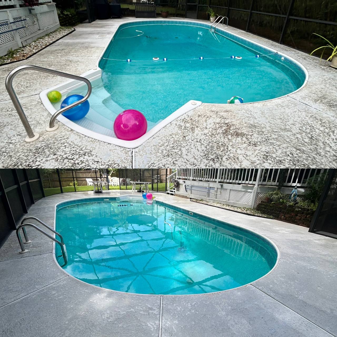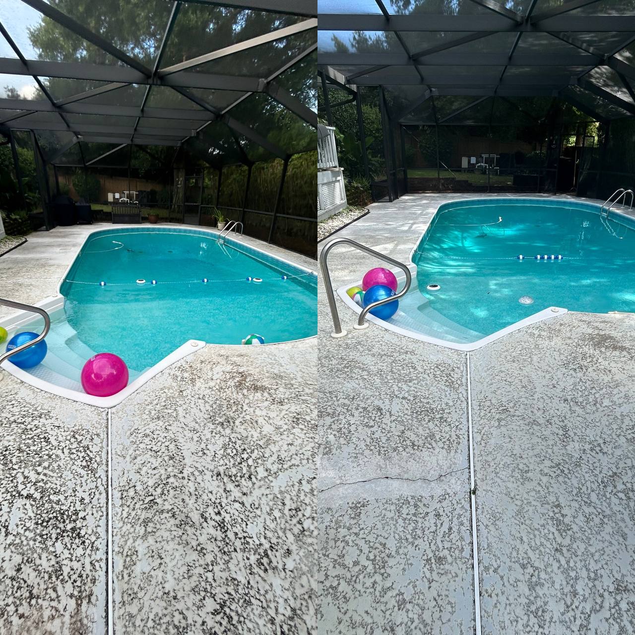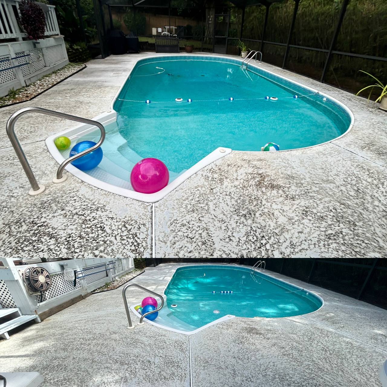This pool deck was professionally pressure washed to remove entrenched filth, algae, mildew, and tenacious stains that degrade the concrete and pose safety risks. The change creates a clean, polished, and secure poolside setting, ideal for events and everyday enjoyment. Routine pool deck cleaning improves curb appeal while also protecting your investment by reducing wear caused by organic growth.