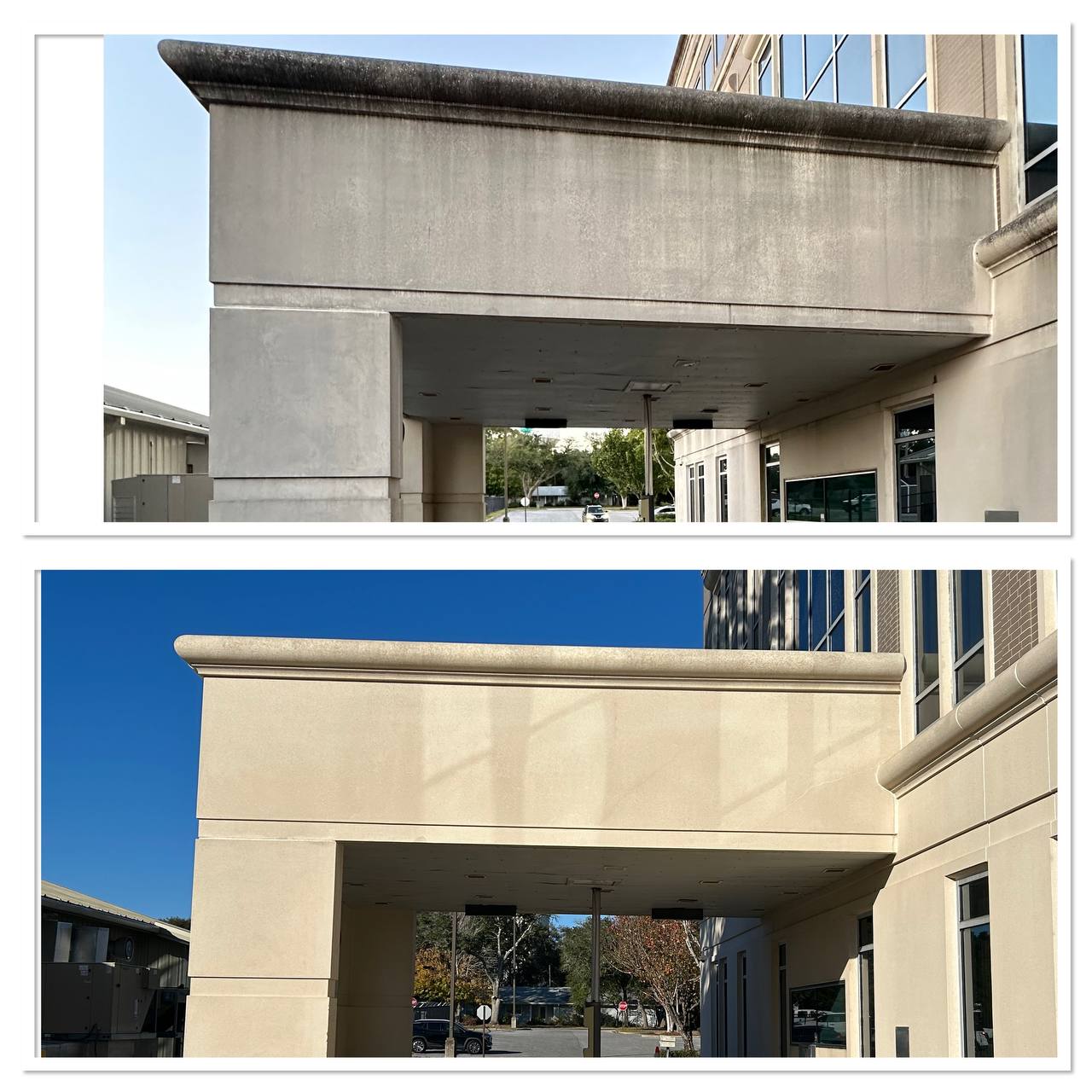 Our team successfully completed a top-quality commercial exterior cleaning project in Okaloosa County, Florida, for a government facility. Using professional-grade soft washing and pressure washing services, we safely removed dirt, mold, mildew, algae, and environmental buildup from the building’s exterior surfaces. This commercial pressure washing and soft wash service restored the property’s clean, professional appearance while helping protect the structure from long-term damage caused by organic growth.